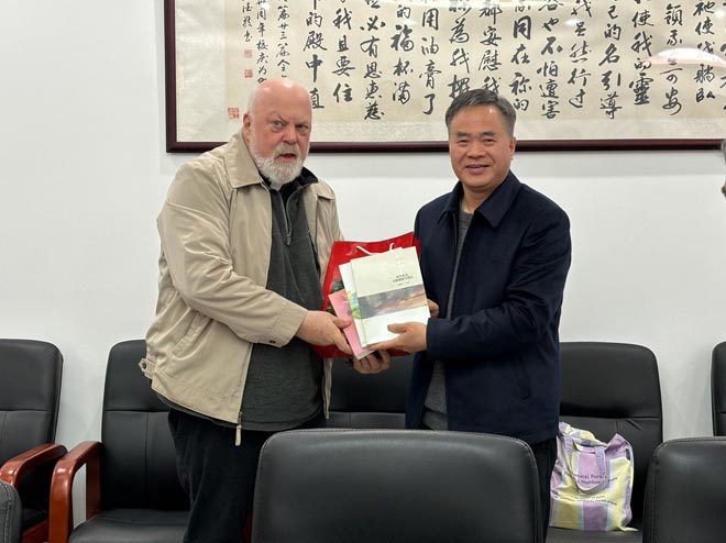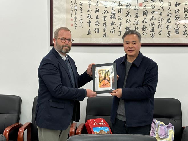 座谈结束后,双方互赠礼物。谢炳国院长带领来宾参观了电钢琴教室,爱国主义教研室和图书馆等。